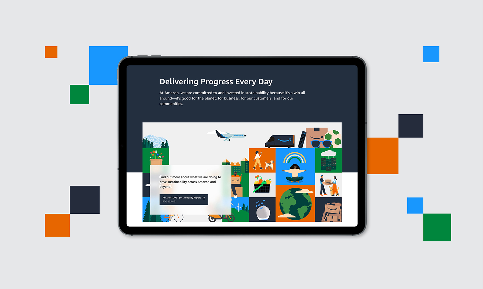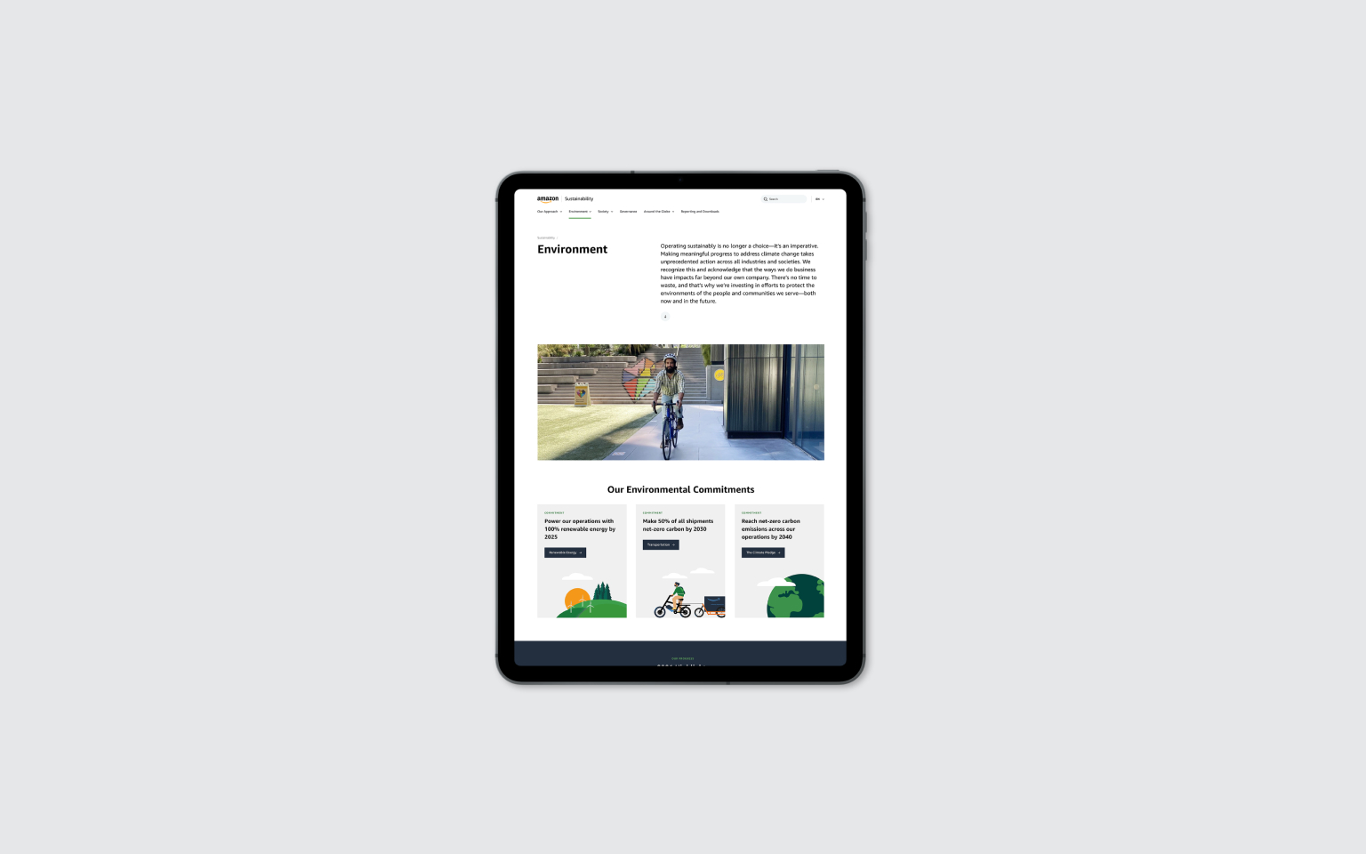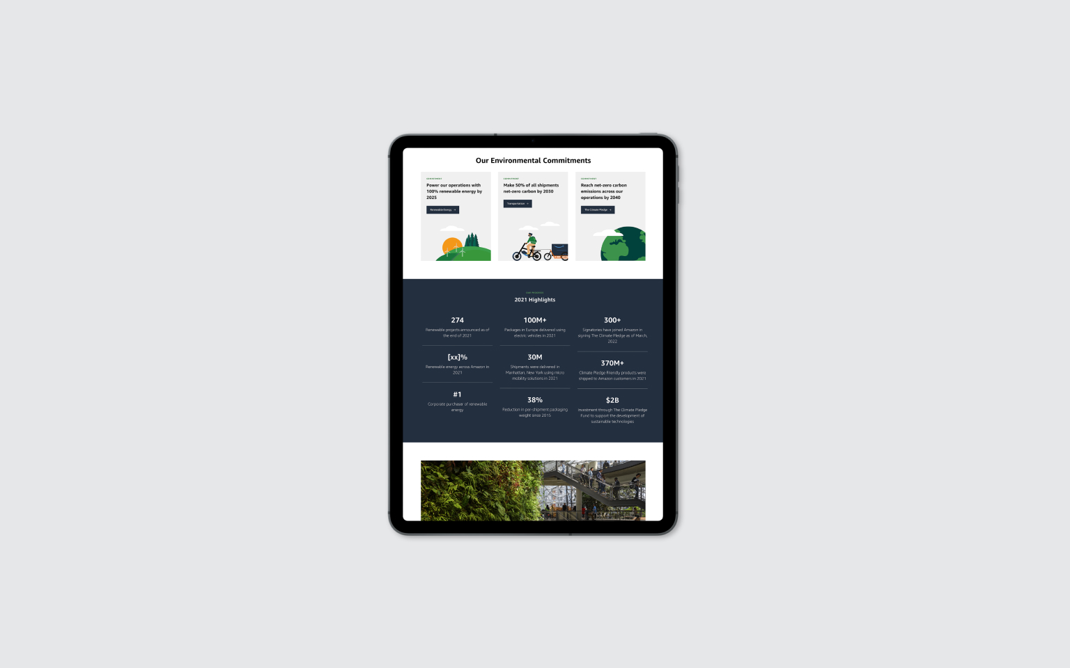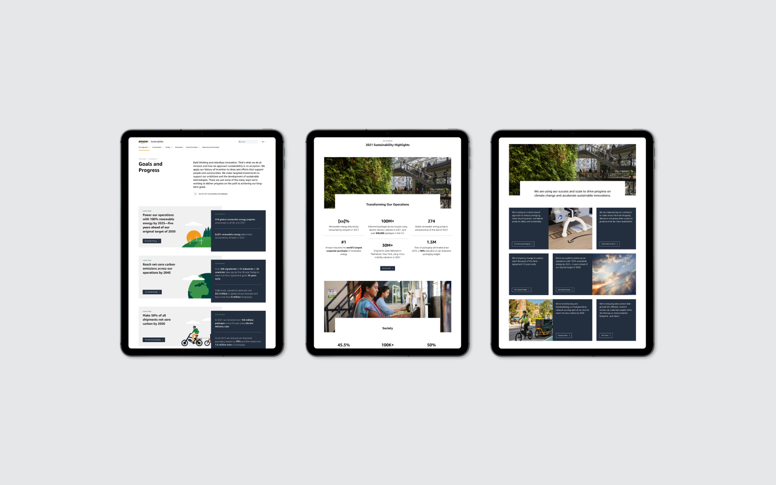 Amazon needed a way to communicate its complex sustainability goals in a way that felt human, interactive, and globally accessible. The project called for a scroll-based digital narrative that would connect with audiences visually while staying grounded in facts and responsibility. Working closely with the content and development teams, I was lead digital designer in a team that delivered a sleek microsite experience that paired clean UI with subtle motion, data visualisation, and responsive layouts. The journey is scroll-triggered, moving users through chapters of Amazon’s sustainability impact, all while maintaining a fast, accessible, and lightweight experience. The result was a visually engaging story that showcased Amazon’s environmental initiatives through a focused user experience. It balanced storytelling with brand clarity, helping to position Amazon as transparent, forward-thinking, and responsible.